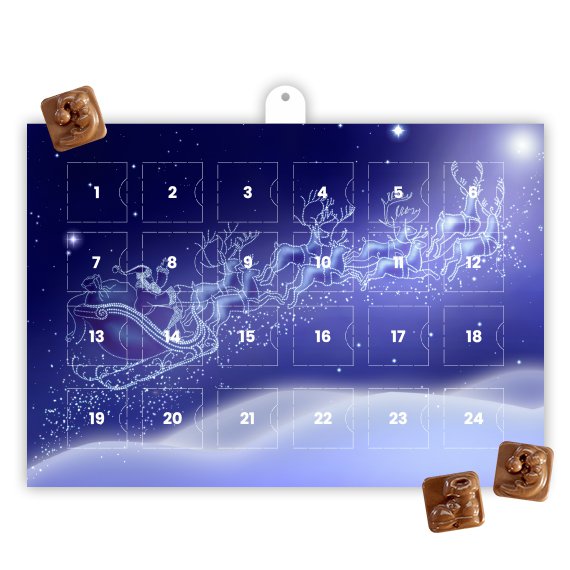 Kalenterin 24 luukussa on täytteenä herkullista maitosuklaata. Kalenteri on valmistettu FSC-sertifioidusta kartongista ja se on täysin muoviton ja 100 % kierrätettävä. Koko n. 207 x 146 x 12 mm. Paino n. 48 g. Säilyvyysaika 6 kk. Pakkaus 50 kpl / ltk. Myynti 50 kpl erissä.