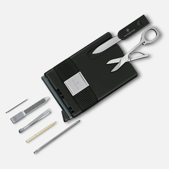 Korttilompakko, rahalenkki ja integroitu monitoimikortti yhdessä paketissa! RFID-suojattu korttilompakko tarjoaa kuudelle eri kortille turvallisen säilytystilan. Lompakon napin painalluksella saat käyttöösi koteloon varastoidut kortit porrastetusti ja kätevästi. Rahalenkki pitää setelit turvallisesti paikoillaan. Tuotteen viimeistelee 8 integroitua työkalua: hammastikku, pinsetit, kuulakärkikynä, kynsiviila, ruuvimeisseli (2,5 mm), neula, sakset ja pieni terä. Mitat 65 x 104 x 17 mm. Paino 81 g.