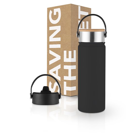 Ruostumattomasta teräksestä valmistettu termospullo kahdella eri korkilla. Valitse pulloosi ajaton bambu- tai käytännöllinen sporttikorkki. Molemmissa korkeissa muovinen kahva, josta pulloa on helppo kantaa mukana. Musta jauhemaalattu pinta tarjoaa laajan painoalueen brändillesi. Astiapesukoneen kestävä. Tilavuus: 500 ml. Toimitetaan pahvisessa lahjapakkauksessa.