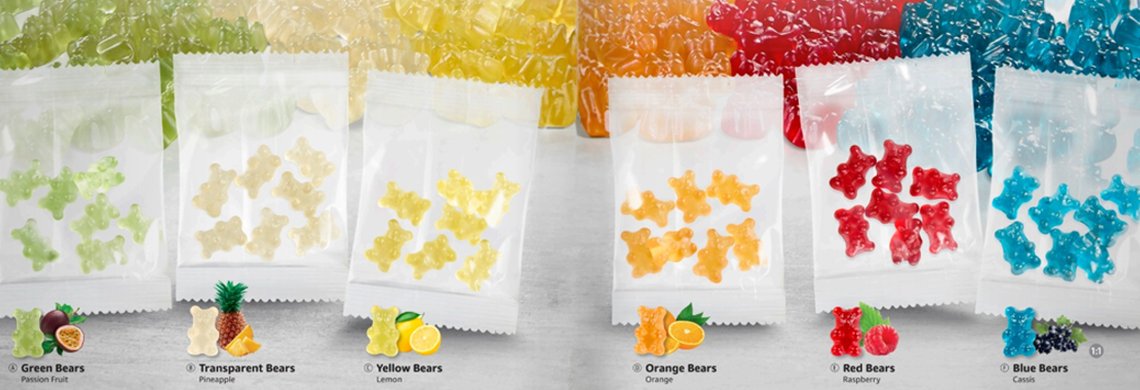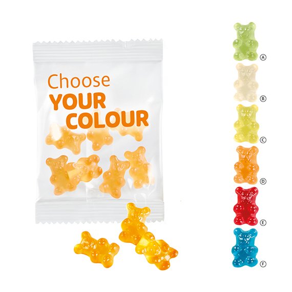 Valitse kuudesta väristä ja mausta juuri sinulle sopiva Premium-nallekarkki. Valittavana vihreä (passionhedelmä), läpinäkyvä (ananas), keltainen (sitruuna), oranssi (appelsiini), punainen (vadelma) tai sininen (mustaherukka).