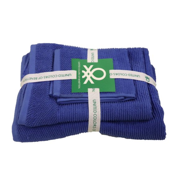 Pehmeä ja imukykyinen pyyhe on 100 % puuvillaa ja sen toista päätyä koristaa kaksivärinen kuviointi ja United Colors of Benetton -kangasmerkki. Setissä on kolme erikokoista pyyhettä: 30x50 + 50x90 + 70x140 cm. Väri sininen.