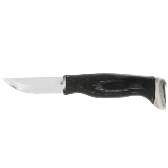 Kotimainen, Lapissa käsityönä valmistettu puukko. Terä on ruostumatonta terästä ja sen pituus on 9,5 cm. Kahva on mustaa visakoivua ja sen päässä on uniikki poronsarvesta valmistettu yksityiskohta. Mukana musta, kotimaisesta nahasta valmistettu nahkakotelo. Hinta sisältää yksittäispakkauksen.