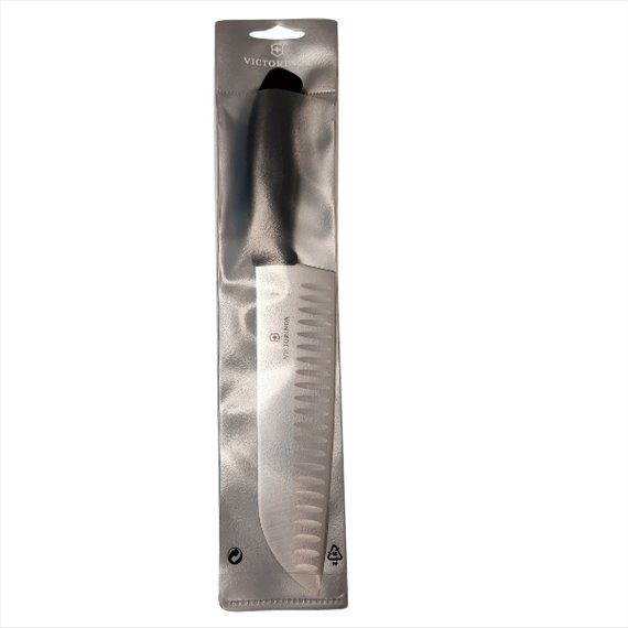 Japanilaisen keittiön vaatimukset veitsille ovat ehkä kovatasoisimmat maailmassa. Victorinox Santoku –veitsessä yhdistyy japanilainen vuosisatainen perinne ja sveitsiläinen huippuosaaminen. Veitsi on täydellisesti tasapainotettu ja siten miellyttävä käyttää. Tottumatonkin huomaa eron tavallisiin veitsiin verrattuna. Veitsessä on leveä, uurrettu terä, joka estää sen tarttumisen leikattavaan tuotteeseen. Veitsi sopii kaikenlaiseen pilkkomiseen ja leikkaamiseen. Veitsen terän pituus on 17 cm. Pakattu muoviblisteriin.