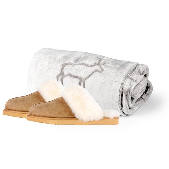 Lahjasetti yhdistää pehmeän porokuvioidun huovan ja aidosta lampaan villasta valmistetut pehmeät tohvelit, jotka tuovat lämpöä ja mukavuutta kesäiltaasi.