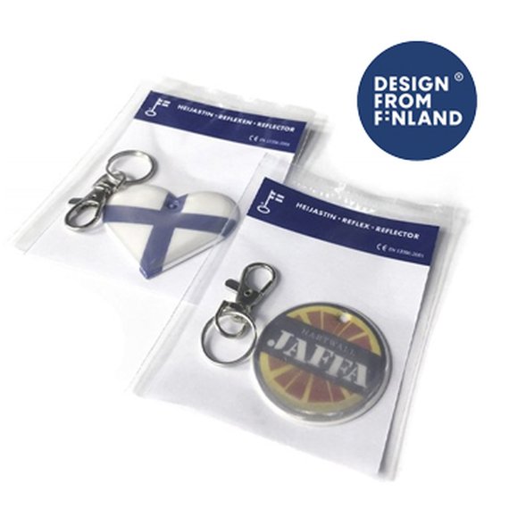 Iltojen hämärtyessä on tärkeää huolehtia omasta ja läheisten näkyvyydestä. Kotimaisella heijastimella varmistat näkyvyytesi kaupungin sykkeessä tai lenkkipoluilla. Hinnat sisältävät käyttöohjeen, saumapussin, painatuksen yhdelle puolelle aloituskuluineen sekä papukaijalukon palloketjulla. Kysy lisää saatavilla olevista muodoista. Heijastimella EN17353:2020 –sertifikaatti.