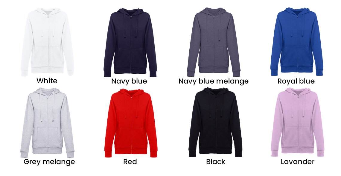 Naisten vetoketjullinen huppari kahdella kengurutaskulla ja usealla värivaihtoehdolla. Hupparin sisäpuoli harjattu ja hupussa kiristysnuori. Paino 320 grammaa. 50 % puuvilla, 50 % polyesteri. Koot S-2XL.