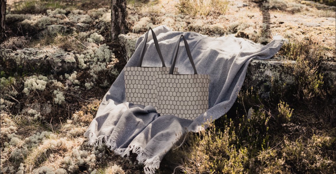 The beautiful Jokipiin Pellava set includes a Graniitti throw blanket in grey and a Jugend shopping bag in white/dark grey. The bag is designed by Vappu Pimiä. The products come in a gift package.