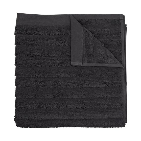 Kohoraitojen koristaman Dyyni-kylpypyyhkeen koko on 70x140 cm. Tummanharmaa pyyhe on 100% puuvillafroteeta ja sen voi pestä koneessa 60 asteessa.