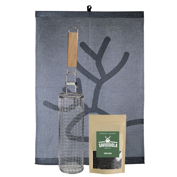 Lahjasetti sisältää upean porokuvioidun keittiöliinan, ruostumattomasta teräksestä valmistetun vihanneshalsterin sekä setin viimeistelee herkullinen savusuola Kreikasta.