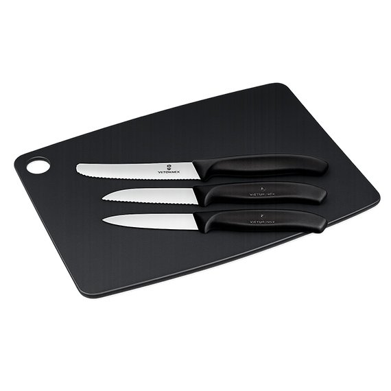 Lahjasetti sisältää selluloosakomposiitista valmistetun leikkuulaudan, joka kestää erinomaisesti lämpöä. Setin viimeistelee Victorinoxin ruostumattomasta teräksestä valmistettu 3 kpl veitsisetti.
