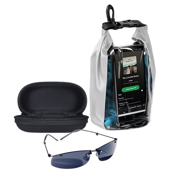 Lahjasetti sisältää veden kestävän 1,5 L dry bagin, joka pitää tärkeimmät tavarasi kuivina. Setin viimeistelee kokoontaittuvat aurinkolasit, jotka saa suojaan omaan vetoketjulliseen koteloon.