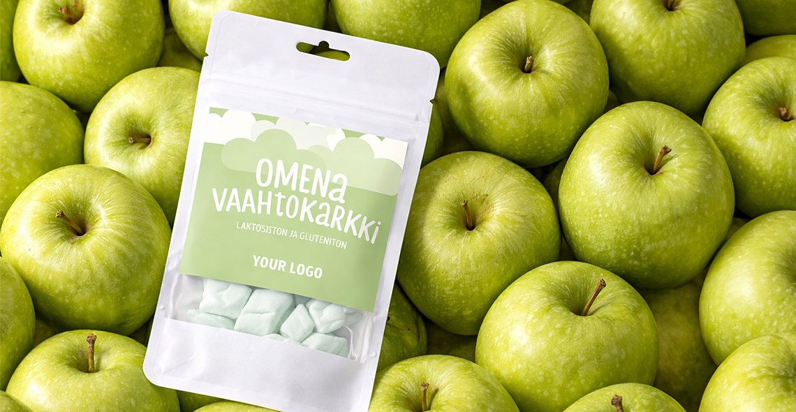 Ainesosat: sokeri, tärkkelyssirappi, omenatäysmehu, hyytelöimisaine (liivate), sorbitoli (1%), happamuudensäätöaine (omenahappo), maissitärkkelys, luontainen omena-aromi, luontainen väri (klorofylli)