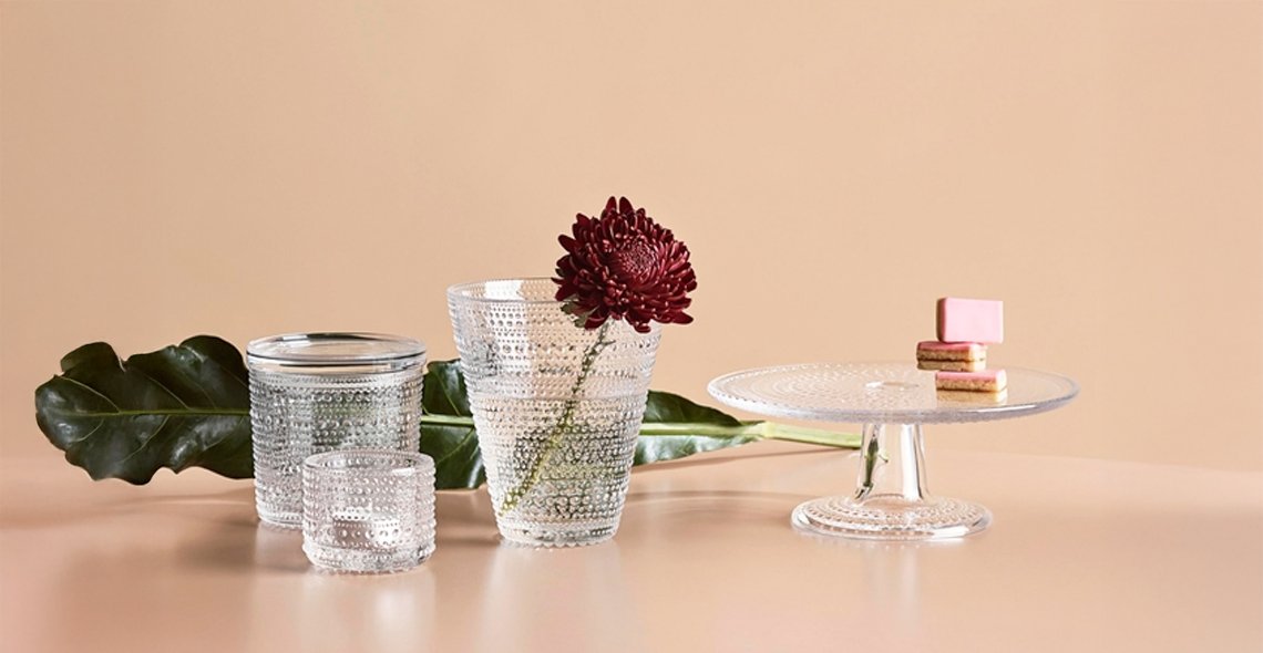 Designer Oiva Toikka wanted to conceal the seams left on pressed glass, and therefore created a new surface structure based on droplet decoration, giving Kastehelmi glassware its distinctive appearance. The shimmering rows of glass beads on the surface of the Kastehelmi collection resemble dewdrops glistening in the morning sun. The glass droplets reflect light beautifully across the surface of these versatile glass items.
