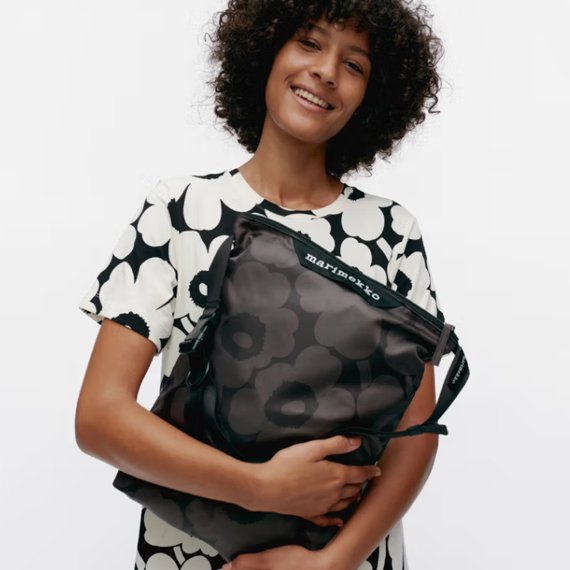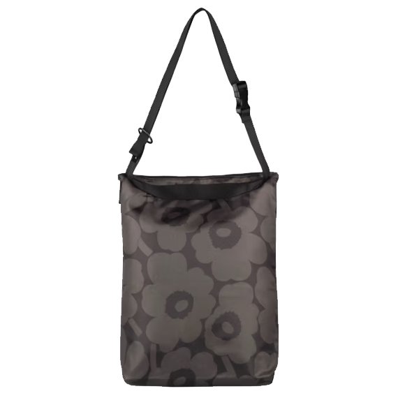 Unikko-kuosinen Neat Crossbody M -olkalaukku on valmistettu kierrätetystä polyesterista. Laukussa on säädettävä, kierrätetystä polyamidista valmistettu olkahihna. Laukku sulkeutuu vetoketjulla, ja siinä on Marimekko-tuotemerkkilappu edessä. Sisäpuolella on pieni avoin tasku, johon koko laukun voi taitella säilytystä varten.