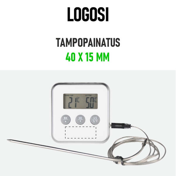 Digitaalinen paistomittari ajastimella on täydellinen kumppani lihan, kalan ja leivonnaisten valmistuksessa. Mittarin takana tukijalka. Ruostumattomasta teräksestä valmistettu anturi metallijohdolla. Johdon kokonaispituus 120 cm. Lämpöasteikko max. 250 °C / 482 °F. Ajastin max. 99 min 59 sec. Mitat 80 x 80 x 13,5 cm. Tuote sisältää 1 x AAA pariston.