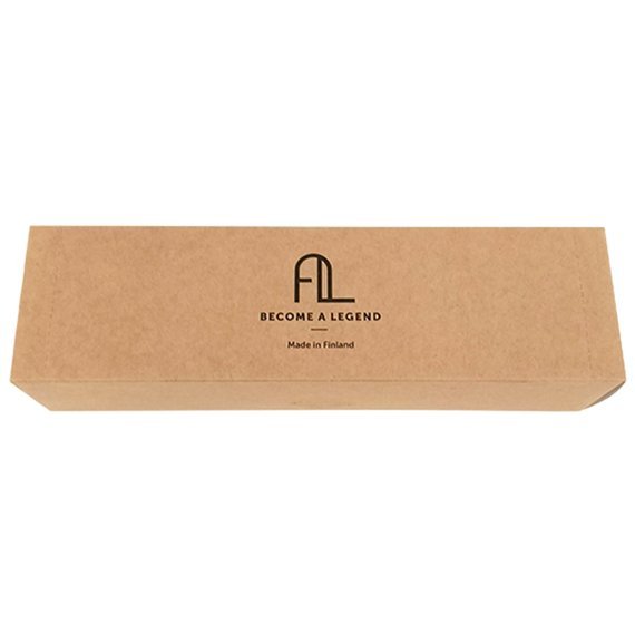 A handcrafted puukko knife made in Lapland, Finland. The blade is 9.5 cm stainless steel, and the handle is made of curly birch, featuring a unique detail made from reindeer antler. Comes with a black leather sheath made from domestic leather.