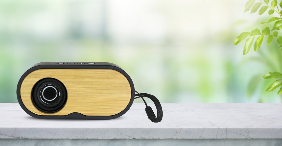 The beautiful Nature speaker combines style and functionality, with bamboo accents that bring a natural touch. Made from recycled ABS material, it features wireless BT v5.0 connectivity. Inputs include USB-A and MicroUSB. The speaker delivers 3 W of power, has a 1,200 mAh battery, and offers up to 5 hours of playback. It also supports hands-free calling, volume control, and mobile device playlists. A USB-C charging cable is included.