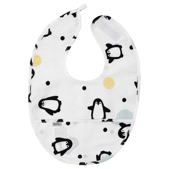 Ihastuttava lasten ruokalappu pingviinikuosilla. Koko 28 x 29 cm. Masteriaali 100% puuvillaperkaali. Sympaattinen kuosi on Minna Niskakankaan suunnittelema. Tuotteella on Design From Finland -merkki.