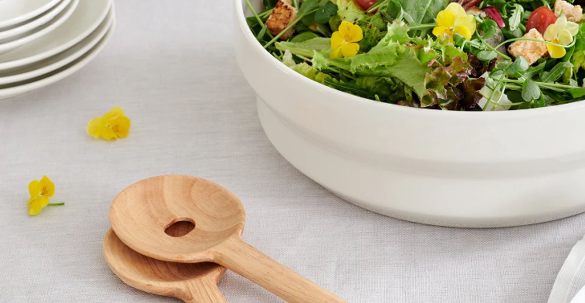Minna Niskakankaan suunnittelemat kumipuusta valmistetut Oras-salaattiottimet sopivat monenlaiseen tarjoiluun ja yhdistettäväksi erilaisten tarjoilukulhojen kanssa. Mitat 8 x 29 cm.
