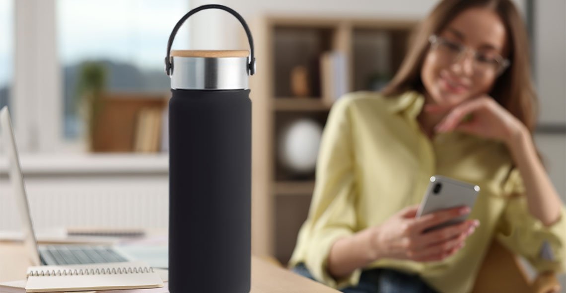 Ruostumattomasta teräksestä valmistettu termospullo kahdella eri korkilla. Valitse pulloosi ajaton bambu- tai käytännöllinen sporttikorkki. Molemmissa korkeissa muovinen kahva, josta pulloa on helppo kantaa mukana. Musta jauhemaalattu pinta tarjoaa laajan painoalueen brändillesi. Astiapesukoneen kestävä. Tilavuus: 500 ml. Toimitetaan pahvisessa lahjapakkauksessa.