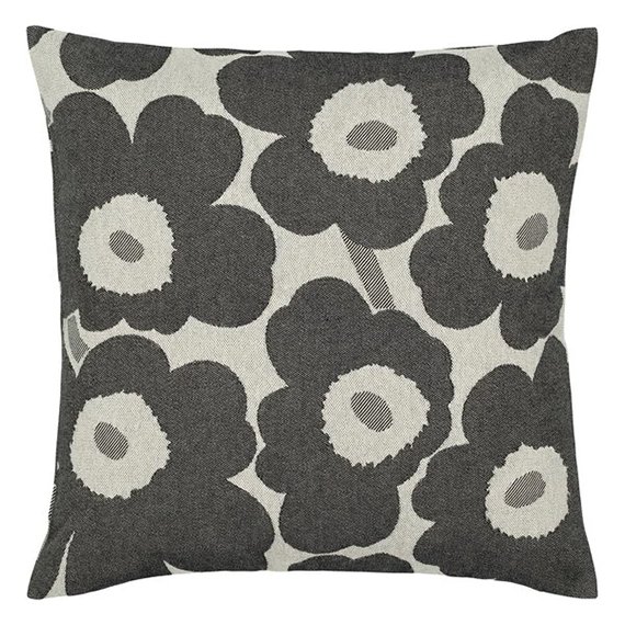 Jacquard-kudottu Pieni Unikko -kuosinen tyynynpäällinen on valmistettu puuvillapellavasta. Jacquard-tekniikalla kudotuissa tuotteissa voi esiintyä pieniä mittaeroja. Päällisessä on piilovetoketju yhdellä sivulla. Tyynynpäällisen koko 47 x 47 cm. Väri luonnonvalkoinen/hiilenharmaa.