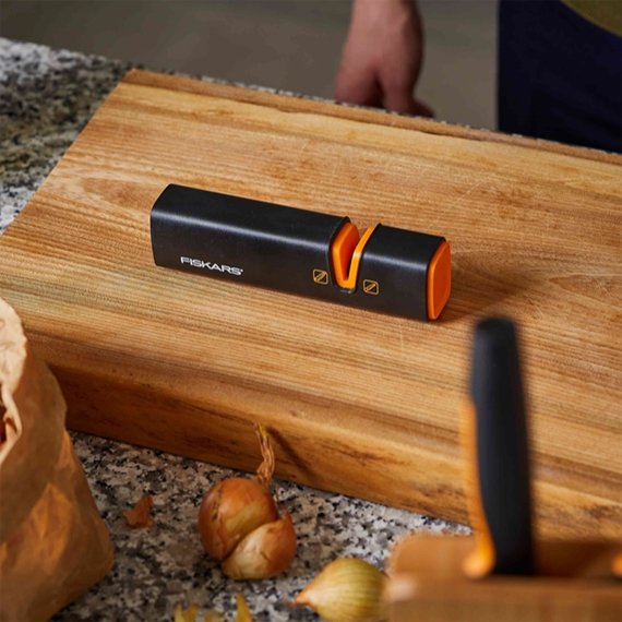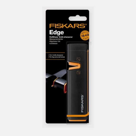 Fiskars Edge -sarjan muotoilussa yhdistyy kestävyys, innovatiivisuus ja äärimmäinen suorituskyvyn. Myös keraaminen Fiskars Edge Roll-Sharp™ -veitsenteroitin on helppokäyttöinen. Veitsenteroitin tarjoaa optimaalisen leikkuukulman ja suorituskyvyn vuosiksi eteenpäin. Veitsenteroitin sopii sekä oikea- että vasenkätisille. Pohjan silikonirengas pitää veitsenteroittimen paikoillaan työskentelyn aikana. Sopii sekä paksummille terille että isommille keittiöveitsille ja lihakirveille. Helppo purkaa osiin ja puhdistaa. Konepesun kestävä. Suunniteltu Suomessa.