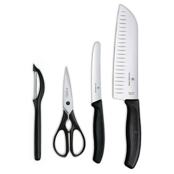 An essential set for every kitchen by Victorinox. When you have the right tools, the culinary possibilities are endless. Invest in Swiss quality and get the classic kitchen set with 4 pieces. These are the essential go-tos for all your everyday culinary tasks. With ergonomic handles and ultrasharp stainless steel blades, you'll be sure to get cooking in no time. The set includes multipurpose kitchen shears, a universal peeler, a tomato and table knife, and the great Santoku knife. Black handles.