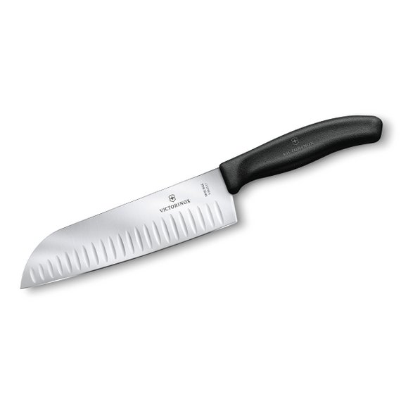 Japanilaisen keittiön vaatimukset veitsille ovat ehkä kovatasoisimmat maailmassa. Victorinox Santoku –veitsessä yhdistyy japanilainen vuosisatainen perinne ja sveitsiläinen huippuosaaminen. Veitsi on täydellisesti tasapainotettu ja siten miellyttävä käyttää. Tottumatonkin huomaa eron tavallisiin veitsiin verrattuna. Veitsessä on leveä, uurrettu terä, joka estää sen tarttumisen leikattavaan tuotteeseen. Veitsi sopii kaikenlaiseen pilkkomiseen ja leikkaamiseen. Veitsen terän pituus on 17 cm. Pakattu kartonkiblisteriin.