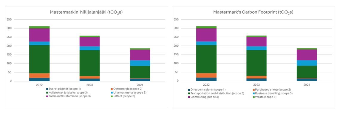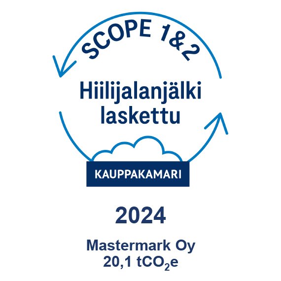 Mastermark on sitoutunut vähentämään ilmastovaikutuksiaan ja toimimaan vastuullisesti. Hiilijalanjälkilaskenta auttaa meitä seuraamaan päästöjä ja kehittämään toimenpiteitä kohti hiilineutraaliutta. Laskentamme perustuu GHG-protokollaan. Vuoden 2024 Scope 1 ja 2 -laskennan on tarkistanut Keskuskauppakamari.